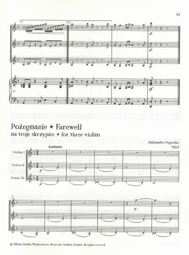 Muzykowanie to dla grającego radość. Jeżeli natomiast mozna muzykowac wspólnie, zwłaszcza z kolegami ze szkoły, radość jest tym większa-jak w zabawie. Niniejsy zbiór utworów na troje skrzypiec oraz na dwoje i troje skrzypiec z towarzyszeniem fortepianu napisałem dla swoich uczniów, by - wspólnie muzykując - mogli rozwijać swoje umiejętnośi i uczyć się współpracy. Mam nadzieję, że zamieszczone tu utwory ucieszą także innych młodych wykonawców i zachęcą ich do kameralnego muzykowania.