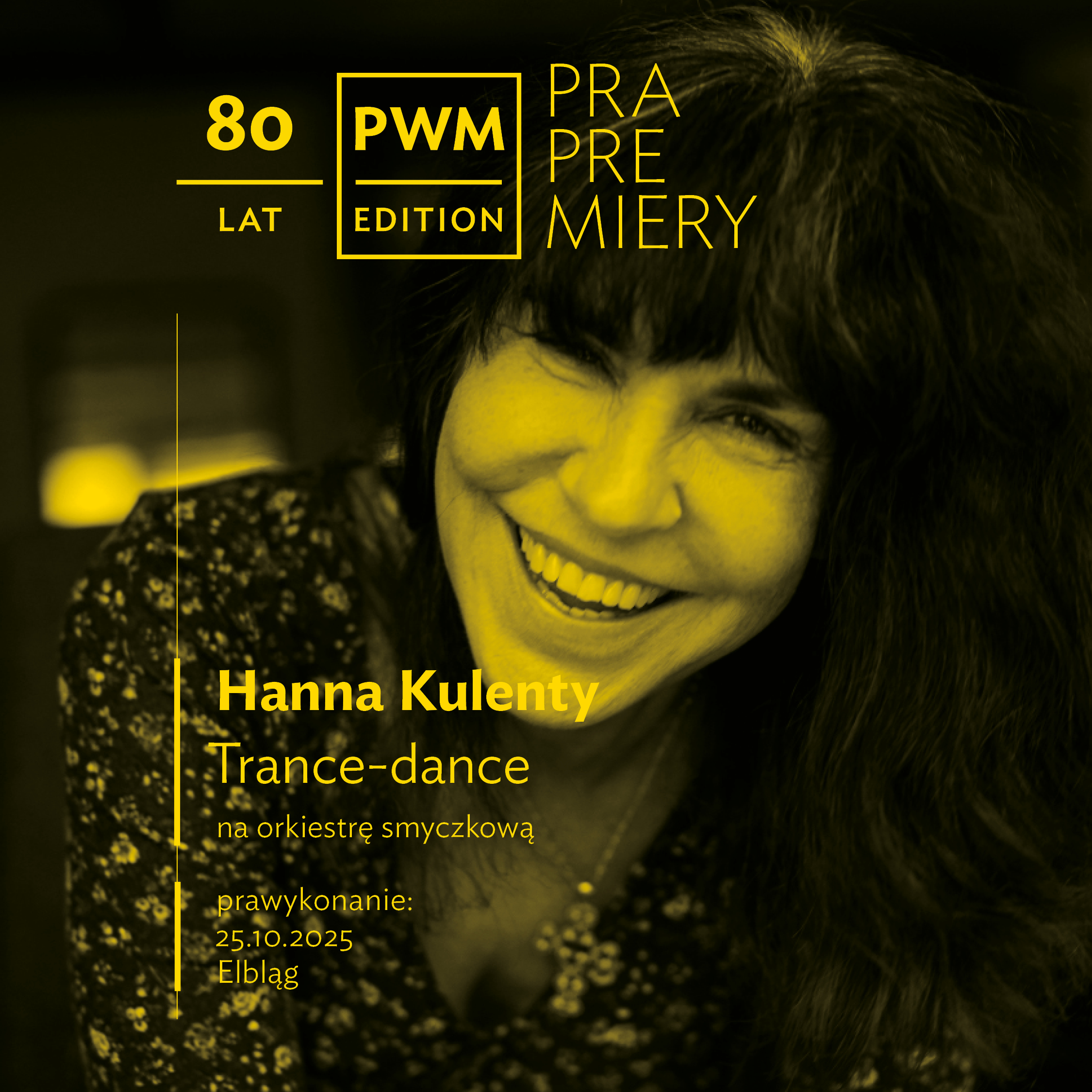 Zindywidualizowany język muzyczny oparty na autorskich technikach „polifonii łuków” i wywiedzionej z niej „polifonii wymiarów czasu” to wizytówka twórczości Hanny Kulenty. Specjalnie dla Elbląskiej Orkiestry Kameralnej kompozytorka napisała Trance-dance na smyczki, dziesięciominutowy utwór, w którym charakterystyczna polifonia wybrzmiewa w całej swej okazałości. Premiera 25 października w Sali Koncertowej Zespołu Państwowych Szkół Muzycznych w Elblągu. Elbląską Orkiestrę Kameralną poprowadzi Maciej Tomasiewicz.