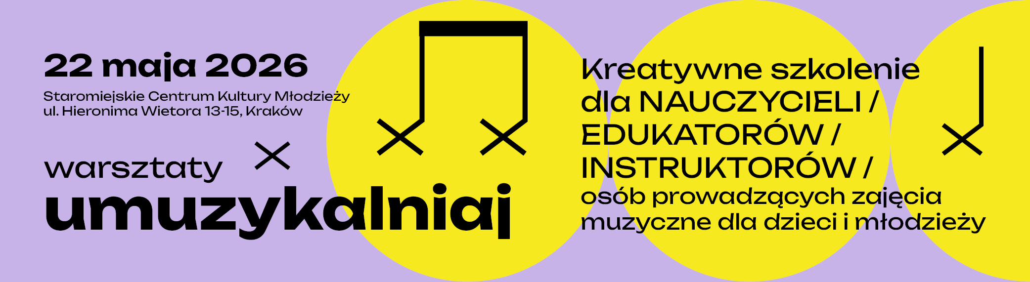 „UMUZYKALNIAJ” to szkolenie skierowane do nauczycieli przedszkolnych i szkolnych, prowadzących zespoły muzyczne, edukatorów, animatorów oraz wszystkich tych, którzy prowadzą różnego rodzaju zajęcia muzyczne dla dzieci i młodzieży. Wydarzenie odbędzie się w Staromiejskim Centrum Kultury Młodzieży przy ul. Hieronima Wietora 13-15 w Krakowie i potrwa od godz. 9:00 do 14:00.