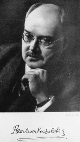 Raoul Koczalski, Raul, von, pseud. Georg Armand, urodzony 3 stycznia 1884r. w Warszawie, zmarł 24 listopada 1948 roku w Poznaniu, polski pianista i kompozytor. Pierwszymi jego nauczycielami muzyki byli jego rodzice. W 1888 roku, w wieku 4 lat, debiutował na koncertach w Warszawie (15 marca) i Rydze (31 października), rozpoczynając karierę „cudownego dziecka” (grał m.in. mazurki i walce Chopina). W 7. Roku życia otrzymał nagrodę konserwatoriom w Paryżu (Premier Prix d’Enfant), a także tytuły nadwornego pianisty króla Hiszpanii, szacha perskiego i sułtana tureckiego. Występował w całej Europie, jego repertuar obejmował także utwory Bacha, Beethovena („Sonata Waldsteinowska”), Liszta, Antona Rubinsteina i Paderewskiego; w 1896 roku w Lipsku obchodził już jubileusz 1000. koncertu. Lekcji gry fortepianu udzielał mu Anton Rubinstein w Petersburgu, a następnie naukę muzyki kontynuował w Warszawie u J. Gadomskiego (fortepian), we Lwowie u H. Jareckiego (instrumentacja), L. Marka (fortepian) i w latach 1902-1905 u K. Mikulego (fortepian i kompozycja). Studiował również muzykologię i filozofię na uniwersytecie w Paryżu. W związku z ożywioną działalnością koncertową przebywał najczęściej za granica, mieszkał głównie w Niemczech (Wiesbaden, Lipsk i Berlin). W czasie II wojny światowej był represjonowany przez władze niemieckie. Zabroniono mu występów publicznych oraz opuszczenia Berlina; organizował mimo to koncerty domowe dla przyjaciół i uczniów. W 1945 roku powrócił do kraju i został profesorem klasy fortepianu w PWSM w Poznaniu i Warszawie, nadal prowadził działalność koncertową. Na 1949 rok planował liczne występy z okazji 100. Rocznicy śmierci F. Chopina. Utwory Chopina w wykonaniu Koczalskiego zostały wydane na płytach Columbia, HMV, Muza, Odeon, Polydor, Pearl CD („Raoul Koczalski Plays Chopin”). W uznaniu zasług dla rozwoju kultury polskiej został pośmiertnie odznaczony Krzyżem Oficerskim Polonia Restituta.
