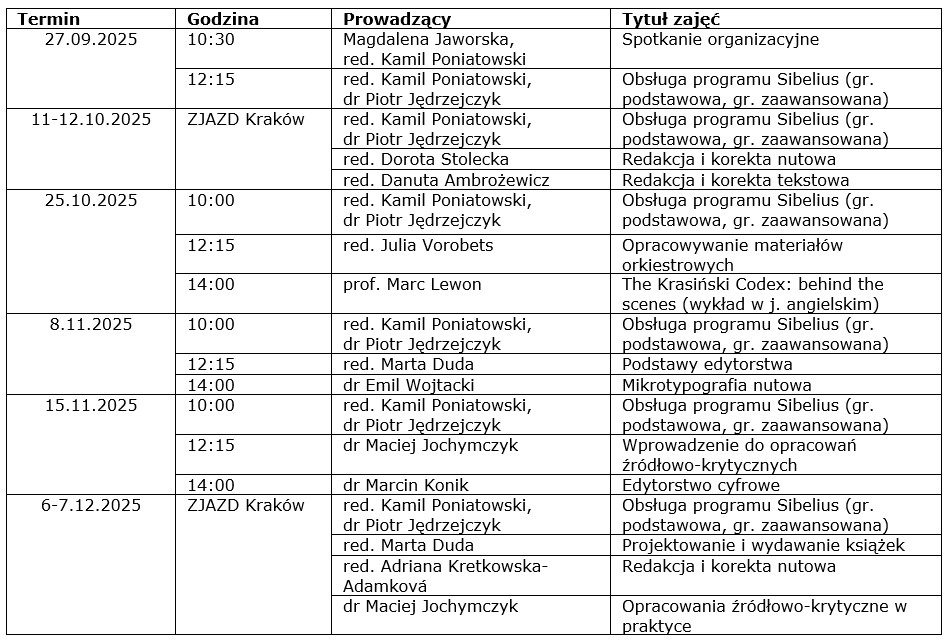 • wykłady i seminaria towarzyszące – zajęcia w jednej grupie poświęcone różnym zagadnieniom związanym z edytorstwem muzycznym, prowadzone przez redaktorów PWM oraz zaproszonych specjalistów, jedno lub dwoje zajęć na każdym spotkaniu; czas trwania: po 1,5h.