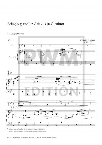 Tomaso Albinoni (1671-1750) należy do czołowych reprezentantów włoskiego baroku, jest kompozytorem oper, instrumentalnych koncertów solowych, sonat, utworów kameralnych. Bardzo znane Adagio g-moll na smyczki i organy prezentujemy obecnie w transkrypcji na flet i fortepian w opracowaniu Grzegorza Olkiewicza. Pełne głębokiego wyrazu Adagio wymaga od flecisty pięknego dźwięku i wrażliwości muzycznej, charakteryzuje się walorami zarówno artystycznymi, jak i dydaktycznymi; z pewnością powinno znaleźć się w repertuarze każdego flecisty.