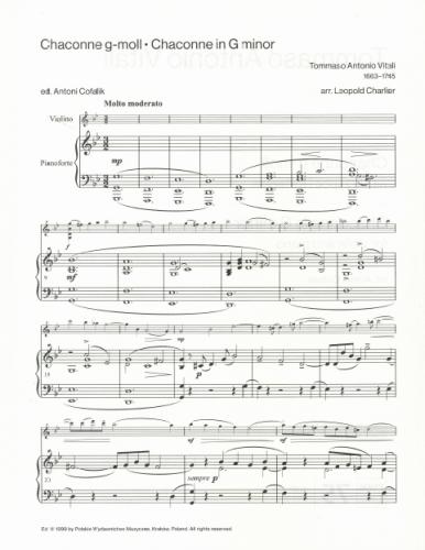 Chaccone g-moll T.A.Vitalego (1663-1745) należy do najpiękniejszych utworów w całej literaturze skrzypcowej. Zaliczana jest do arcydzieł baroku w dziedzinie skrzypcowej. W wersji tej oryginalny tekst muzyczny poddany został nieiwelkim przeróbkom i retuszom. Rezygnując z kilku wariacji, zmieniając nieznacznie układ pozostałych, Leopold Charlier wzbogaca w kilku miejscach partię skrzypiec o dwudżwięki (tercje, oktawy, decymy) oraz dodaje kilka efektownych, wirtuozowskich kadencji. Nową, bogatszą szatę brzmieniową otrzymała także partia akompaniamentu (b.c), która może być wykonywana na organach. Dodano w niej 8-taktowy ostinatowy wstęp, wprowadzając w nastrój utworu. W opracowaniu Charliera utwór nabiera nowych walorów brzmieniowych i instrumentalnych, zyskując na zwartości oraz muzycznej atrakcyjności.