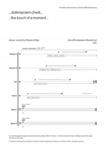 "Utwór …dotknięciem chwili… powstał w 2018 roku na zamówienie Polskiego Narodowego Chóru Młodzieżowego. Wykorzystany przeze mnie tekst w założeniu miał nawiązywać do idei pochwały muzyki, co było wspólną tematyką łączącą wszystkich twórców projektu „Młodzi–młodym”. W swojej kompozycji przeznaczonej na chór mieszany a cappella wykorzystałam fragmenty wierszy polskiego poety Wojciecha Bąka (1907–1961), którego