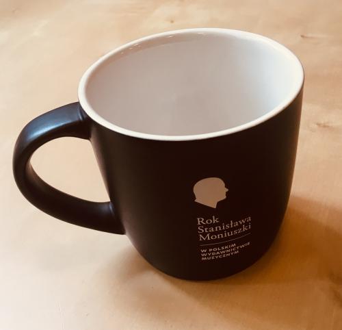 Elegancki czarny kubek kryje na dnie grafikę z profilem Stanisława Moniuszki. Kubek powstał na pamiątkę Roku Moniuszkowskiego.