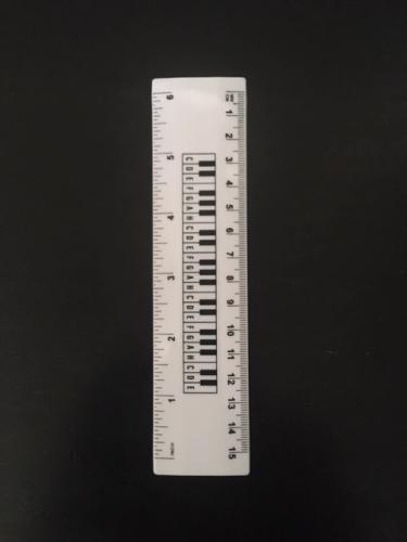 Biała linijka ozdobiona rysunkiem klawiatury. Długość 15 cm. Teraz można "grać" na pianinie nawet podczas matematyki!