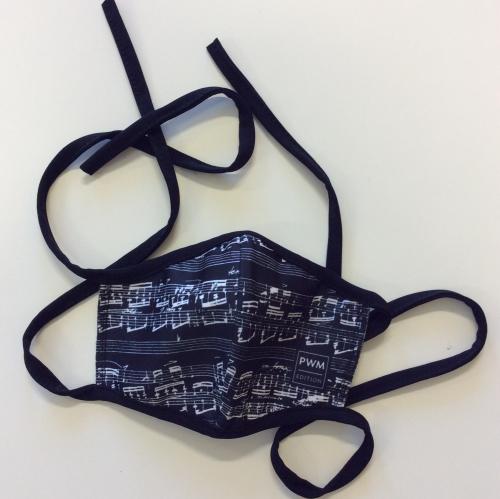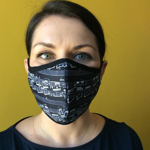 Czarna maseczka ochronna z instrumentami muzycznymi wiązana z tyłu głowy