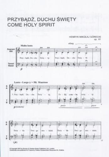 Utwór ''Przybądź Duchu Święty'' na chór mieszany a cappella, jest oparty na tekście słownym sekwencji ''Veni Sancte Spiritus''. Wyróżnia się bogatą harmonią wśród kompozycji sakralnych H.M.Góreckiego.