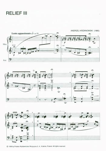 Relief III (1985) składa się z dziewięciu sekcji oddzielonych od siebie podwójnymi kreskami taktowymi, które poprzedza cezura, fermata lub pauza. Odcinki te nie powtarzają się, natomiast zachowana jest pewna stałość motywiczna, korzystająca z trytonowo-sekundowego materiału dźwiękowego. Lento appassionato ulega niewielkim wahaniom, lecz nie wykracza poza granice tempa wolnego. Dynamika, na ogół cicha, wyraźnie zmienia się tylko dwa razy. Gęsta faktura i niełatwy, choć precyzyjnie zapisany rytm, wskazują na inspiracje systemem messiaenowskim. Na uwagę zasługuje również zestawianie obrazu rytmicznego z graficznym zapisem nakładających się na siebie dźwięków, a także akord końcowy, jakby innego pochodzenia, zbudowany z dźwięków c-d-es. Utwór ten (w roku, w którym został napisany) zdobył I nagrodę na Konkursie Kompozytorskim w Kamieniu Pomorskim, a rok później zabrzmiał na Legnickich Dniach Muzyki Kameralnej i Organowej w wykonaniu Juliana Gembalskiego – wybitnego organisty i przyjaciela kompozytora.