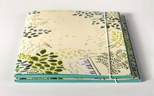 Elegancka kartonowa teczka powlekana świecącą folią, w rozmiarze A4 z ptaszkami. Teczka o grubości 5 mm posiada trzy skrzydła oraz nacięcie na wizytówkę, zamykana na gumkę.