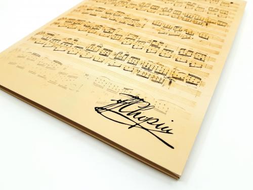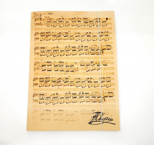 Elegancka kartonowa teczka w kolorze beżowym, z motywem nutowym oraz autografem Fryderyka Chopina. Teczka o grubości 5 mm posiada trzy skrzydła oraz nacięcie na wizytówkę, zamykana na gumkę. Pomieści zarówno format A4 jak i N.