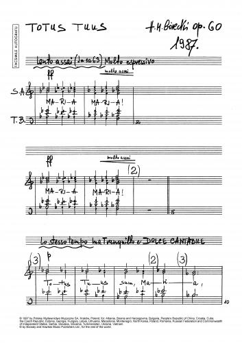 Jednym z najbardziej okazałych utworów na chór a cappella Góreckiego jest powstałe w latach 80. dzieło Totus Tuus. Ma ono niebotyczną wartość, ponieważ powstało z myślą o zupełnie wyjątkowej osobie, cieszącej się ogromnym autorytetem Ojcu Świętym, Janie Pawle II. Tekst polskiej poetki Marii Bogusłowskiej kompozytor zespolił ze słowami tytułowego motta papieskiego. Po raz pierwszy utwór został zaprezentowany na koncercie odbywającym się w ramach III wizyty Papieża Polaka w ojczyźnie. Od tej pory cieszy się niesłabnącą popularnością.
