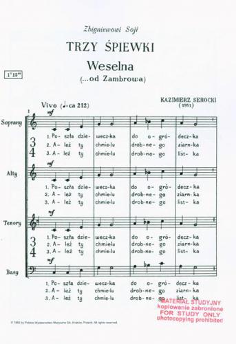Partytura studyjna nie upoważnia do kopiowania i sporządzania głosów wykonawczych. W celu legalnego nabycia większej ilości partytur chóralnych, po preferencyjnych cenach dla zespołu, prosimy wysłać e-mail pod adres: handel@pwm.com.pl lub zajrzeć tutaj