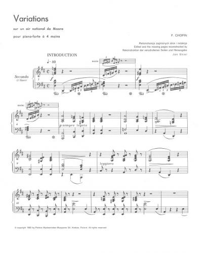 "Wariacje D-dur" są jedynym znanym dotychczas utworem napisanym przez F. Chopina w oryginale na 4 ręce. Brakujące strony, pierwsza i ostatnia, zostały zrekonstruowane przez Jana Ekiera.