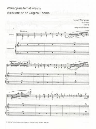 ''Wariacje na temat własny'' op. 15 powstały w 1854 i w tym samym roku ukazały się drukiem, wydane przez firmę Breitkopf und Hartel w Lipsku. Kompozycja oparta na technice wariacyjnej posiada nietypową formę. Temat z trzema wariacjami (w dur) poprzedza molowy wstęp z elementami kadencji. Fragment ten pojawia się ponownie po wariacjach, po czym następuje finał w formie błyskotliwego walca, zakończony efektowną kodą. ''Wariacje'' - podobnie jak inne kompozycje Wieniawskiego - wymagają od skrzypka swobody w grze akordowej i oktawowej, umiejętności wykonywania różnorodnych form staccata, błyskotliwych pasaży czy innych elementów wirtuozowskiej techniki, jak również czystości intonacji flażoletów.