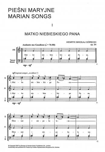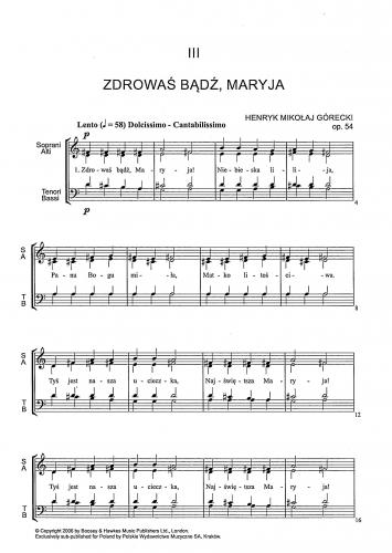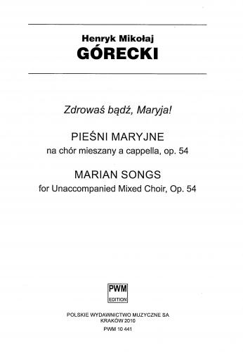 ''Cykl ''Pieśni Maryjnych '' Zdrowaś bądź, Maryja'' na chór mieszany a capella powstał w 1985 roku. W tym okresie H. M. Górecki zbliżył się jeszcze bardziej do muzycznego i duchowego świata Koscioła. W Pieśniach kompozytor sięgnął - już po raz kolejny - po opracowany przez Jana Siedleckiego ''Śpiewnik kościelny'', który ukazuje się od 1878 do czasów współczesnych. W czterech pieśniach tego cyklu wykorzystane są zarówno teksty, jak i melodie z tego właśnie dzieła ( I, II, IV, V ). Pieśni cechuje duża wierność w stosunku do melodii oryginalnych. Kompozytor zachowuje ich tonację i metrum, harmonizując je homofonicznie z powtórkami frazowymi.